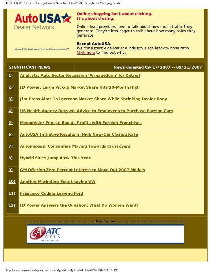 There are five key categories of information in version 1.0 of the Auto-lead Data Format (ADF): Lead (prospect) information Vehicle information Customer (buyer) information Vendor (dealer) information Service provider information Each lead in the ADF file is divided accordingly into four blocks representing each of these categories. ... Get Document